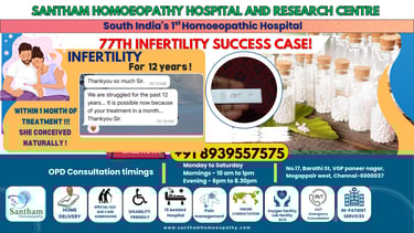 குழந்தையின்மைக்கான ஹோமியோபதி சிகிச்சை, இயற்கையான கருவுறுதல் சிகிச்சை, PCOS க்கான ஹோமியோபதி, ஆண் குழந்தையின்மை சிகிச்சை, சாந்தம் ஹோமியோபதி சென்னை, பக்க விளைவுகள் இல்லாத கருவுறுதல் சிகிச்சை.