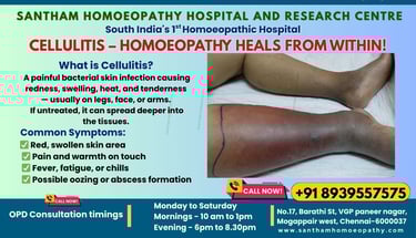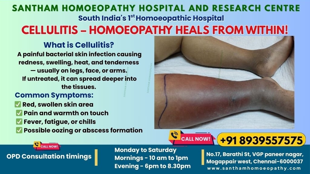 At Santham Homoeopathy, we provide a personalized, holistic approach for cellulitis and skin infections — focusing on the root cause, not just symptom relief.