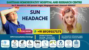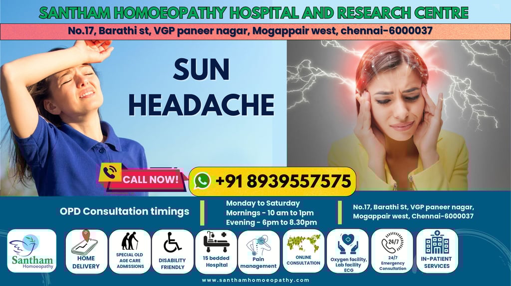 Homeopathic treatment for sun headache, natural cure for heat-induced headaches, best homeopathy for sunstroke, remedies for sunlight migraine, Santham Homeopathy Hospital, headache relief from sun exposure, holistic treatment for summer headaches.