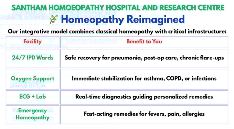 Experience the future of natural healing at Santham Homoeopathy, where ancient wisdom meets modern medical excellence. As South India’s first and only homeopathy hospital with 24/7 IPD, Oxygen Support, In-House Lab & ECG Facilities, we redefine what holistic care truly means.